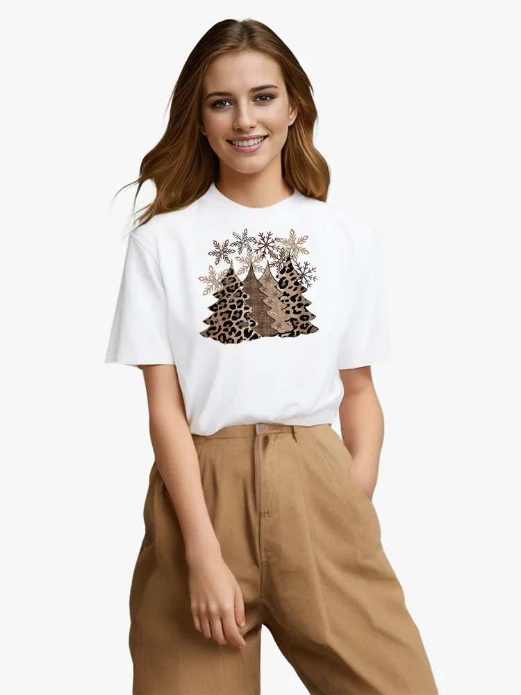 Christmas Leopard Tree Print Crew Neck O-Neck T-Shirt Harajuku Casual Oversized Streetwear Short Sleeve Top Women's Clothing